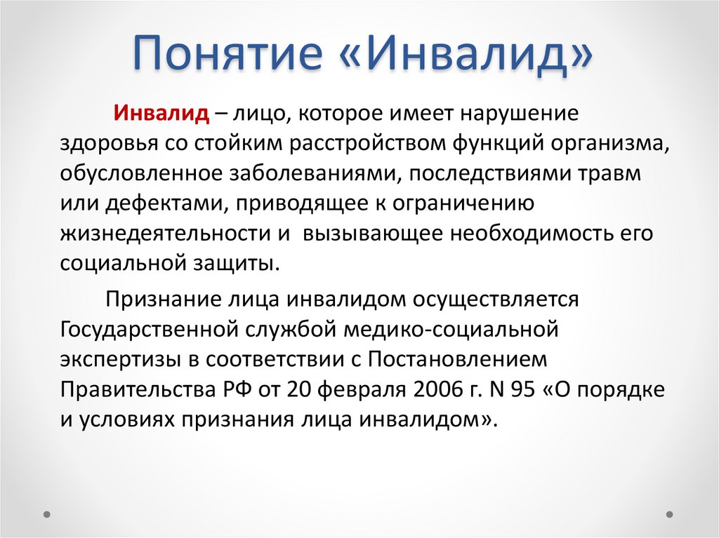 Понятие «Инвалид»Инвалид – лицо, которое имеет нарушение