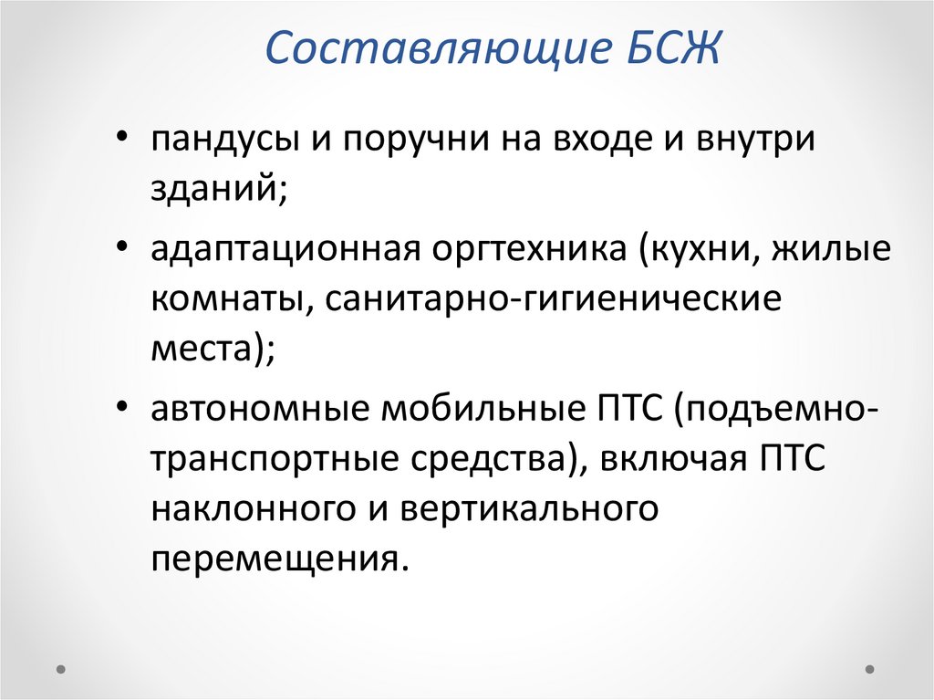 Составляющие БСЖ• пандусы и поручни на входе и внутри