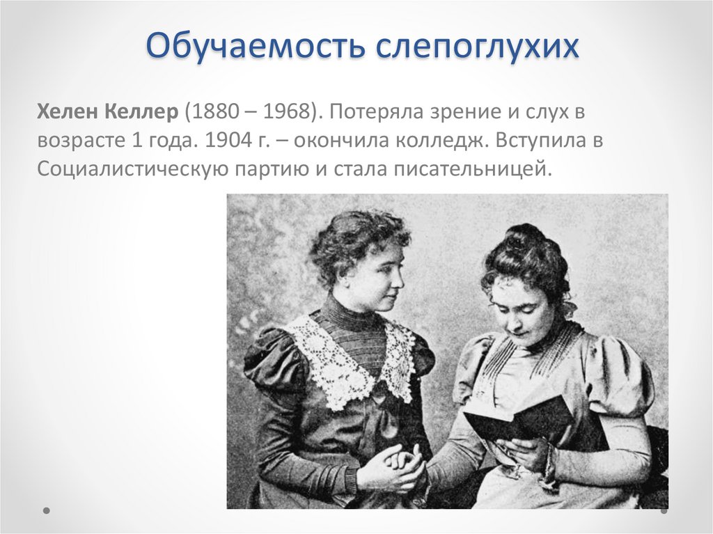 Обучаемость слепоглухихХелен Келлер (1880 – 1968). Потеряла зрение и слух в
