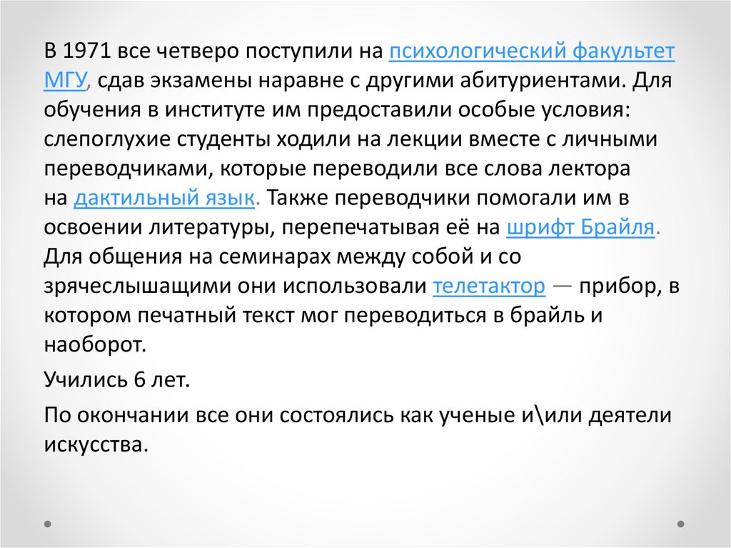 В 1971 все четверо поступили на психологический факультетМГУ, сдав экзамены наравне с другими абитуриентами. Для