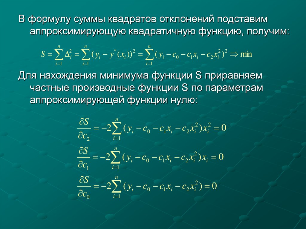 В формулу суммы квадратов отклонений подставимаппроксимирующую квадратичную функцию, получим: