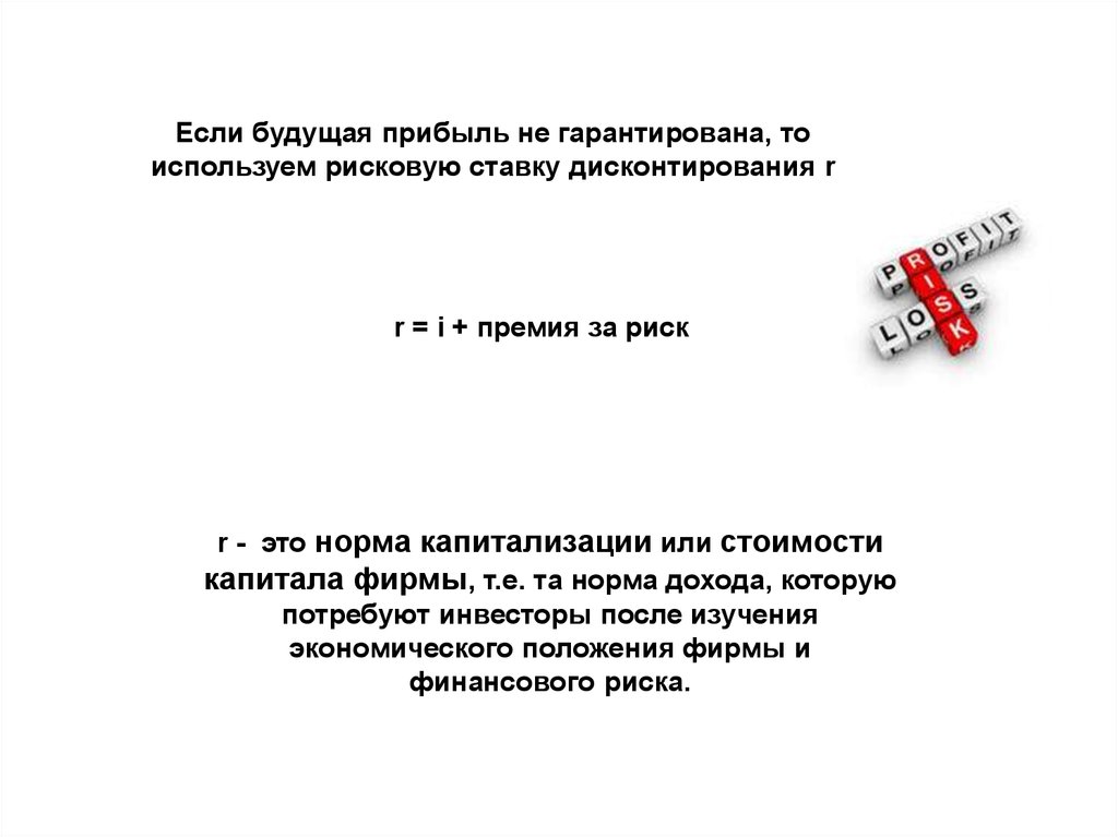 Если будущая прибыль не гарантирована, тоиспользуем рисковую ставку дисконтирования r