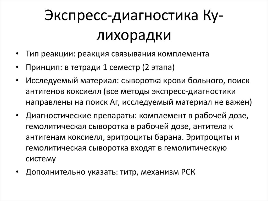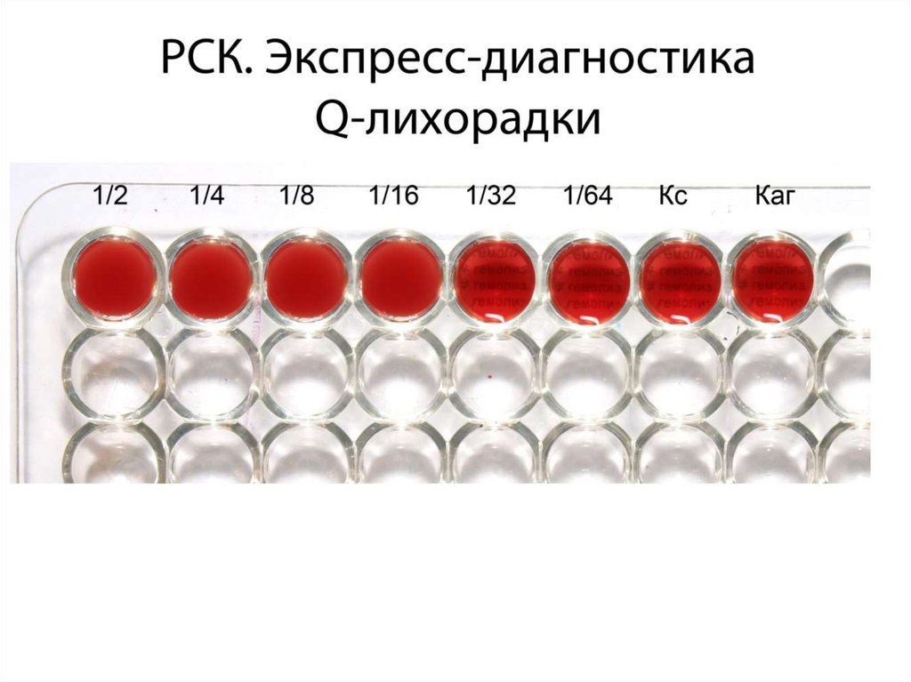 Экспресс-диагностика Кулихорадки• Тип реакции: реакция связывания комплемента