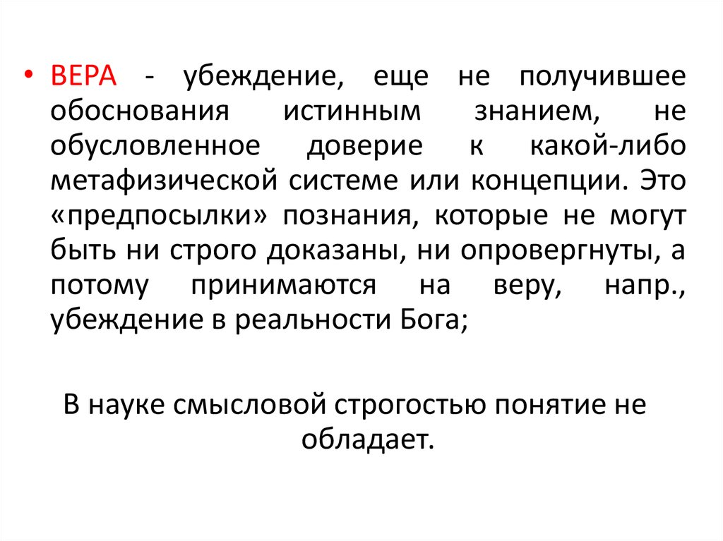 • ВЕРА - убеждение, еще не получившееобоснования