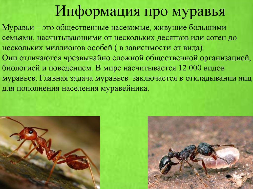 Информация про муравьяМуравьи – это общественные насекомые, живущие большими