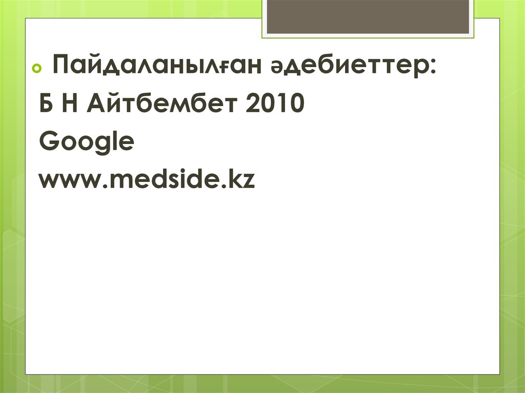 Пайдаланылған әдебиеттер:Б Н Айтбембет 2010