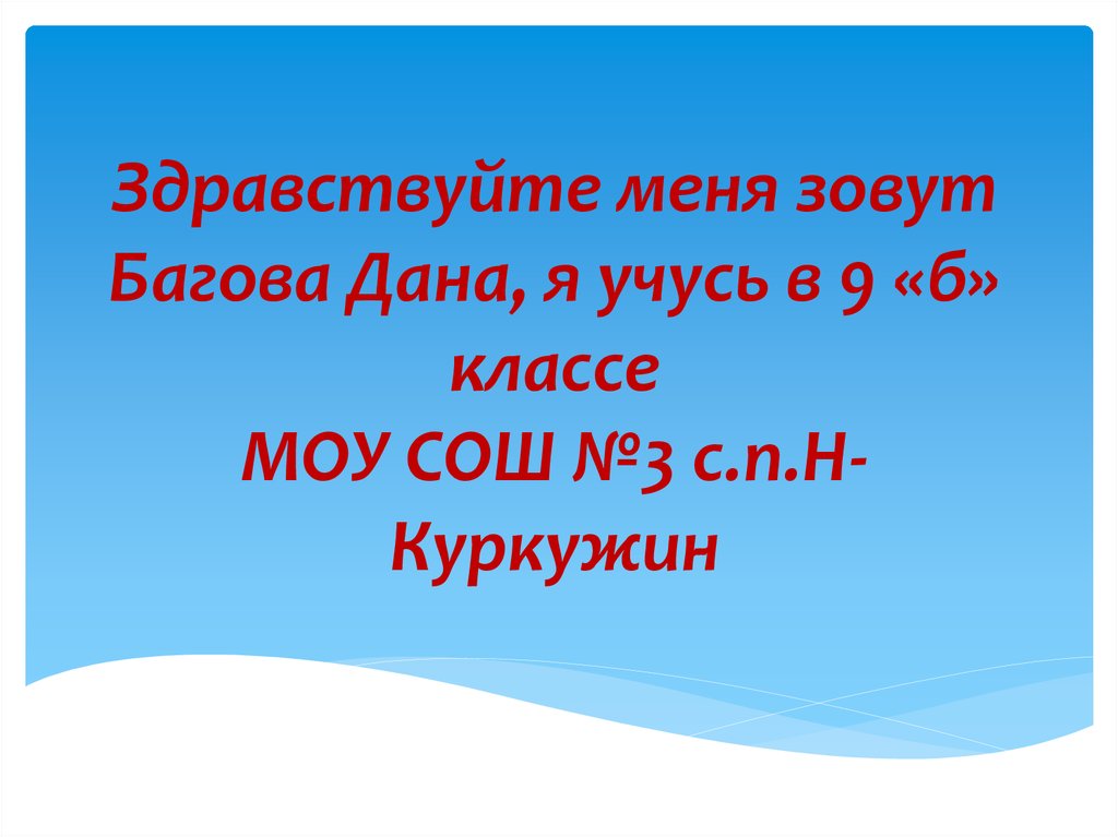 1. Здравствуйте меня зовут Багова Дана, я учусь в 9 «б» классе МОУ СОШ №3 с.п.Н-Куркужин