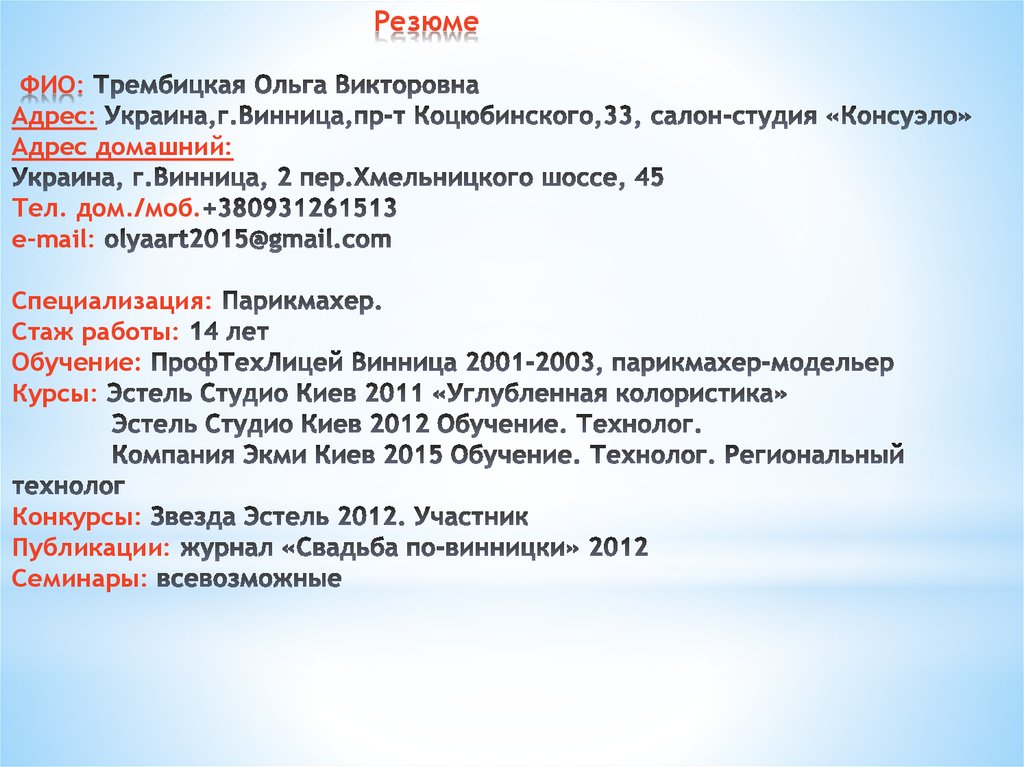 1. Резюме ФИО: Трембицкая Ольга Викторовна Адрес: Украина,г.Винница,пр-т Коцюбинского,33, салон-студия «Консуэло» Адрес домашний: Украина, г.Вин