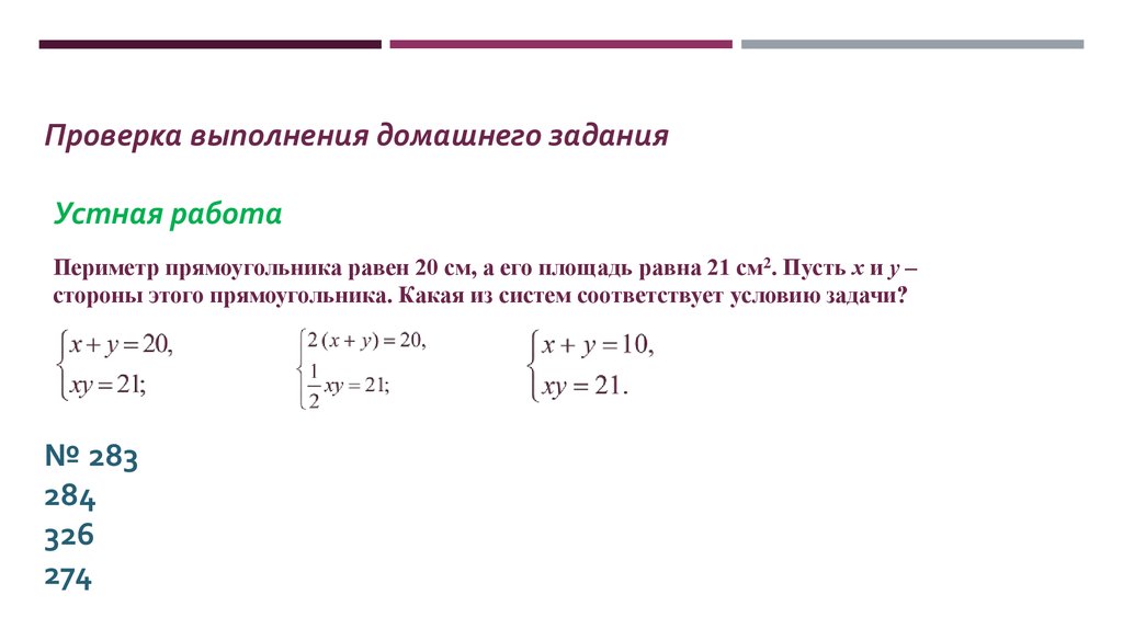 стороны этого прямоугольника. Какая из систем соответствует условию задачи?
