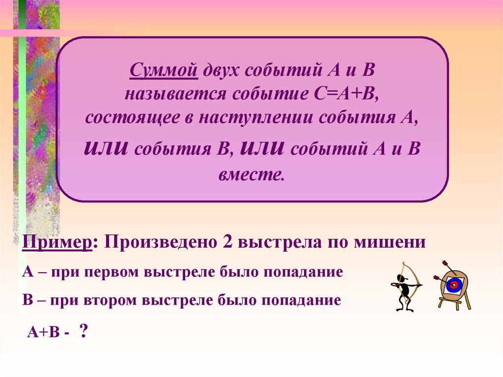 Суммой двух событий А и Вназывается событие С=А+В,