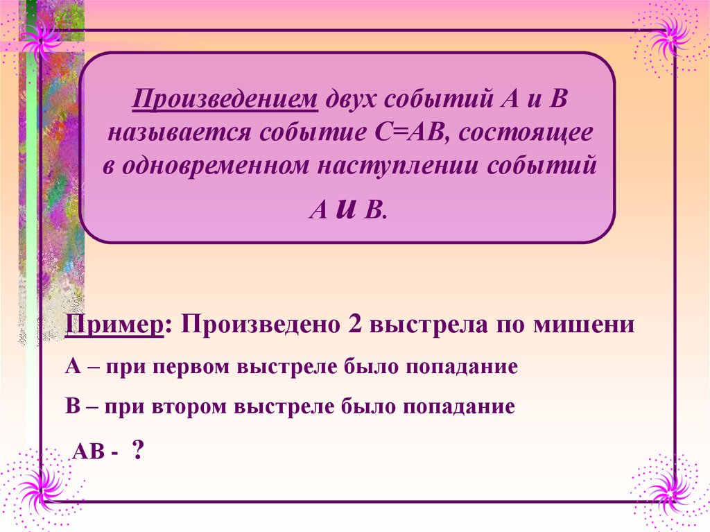 Произведением двух событий А и Вназывается событие С=АВ, состоящее