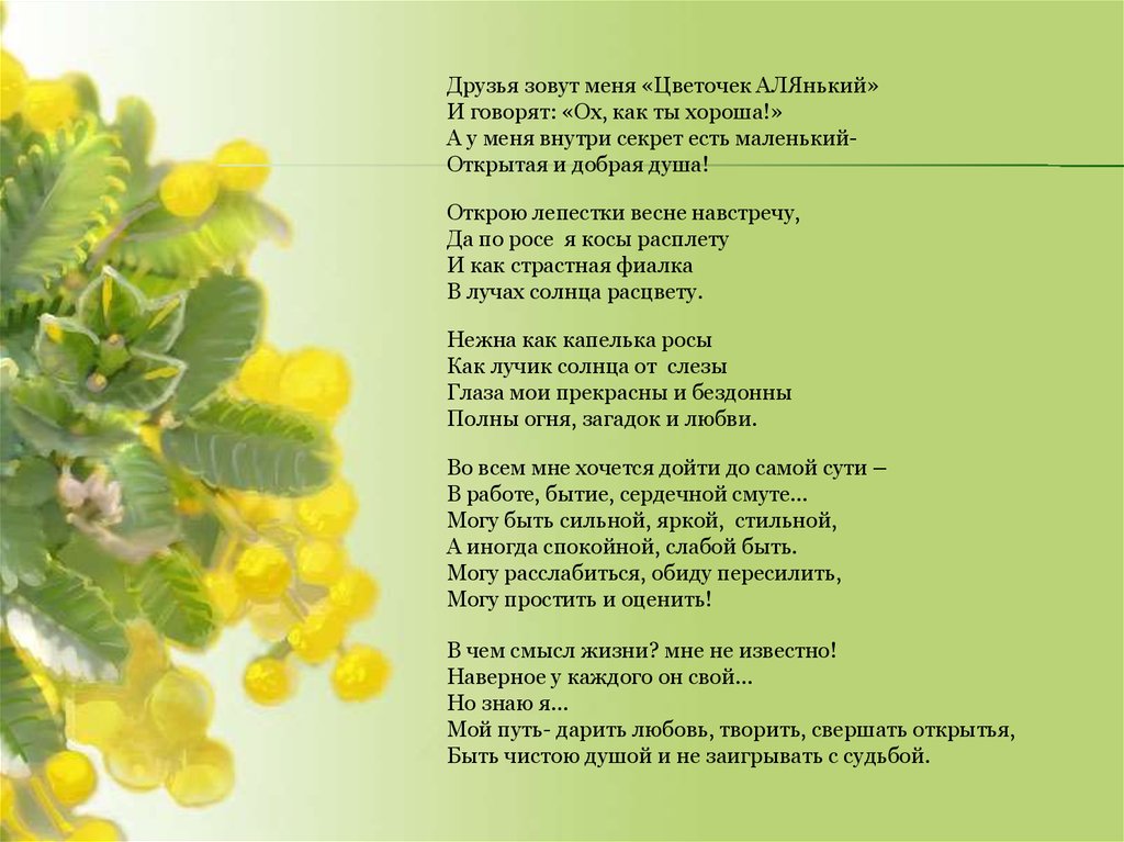 Друзья зовут меня «Цветочек АЛЯнький»И говорят: «Ох, как ты хороша!»