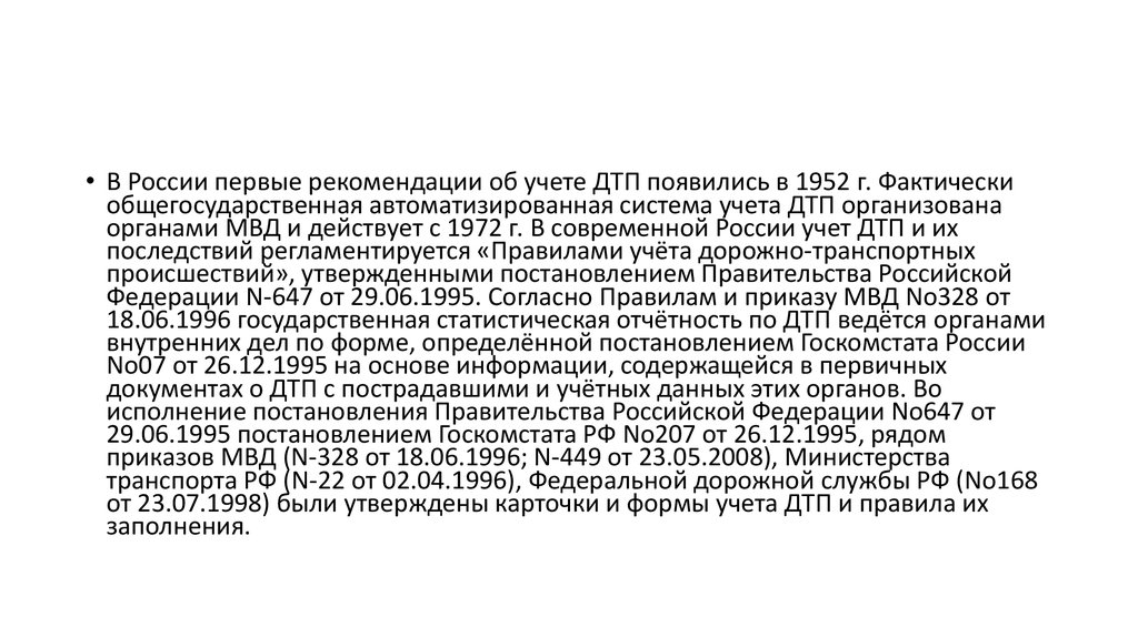 • В России первые рекомендации об учете ДТП появились в 1952 г. Фактическиобщегосударственная автоматизированная система учета ДТП организована