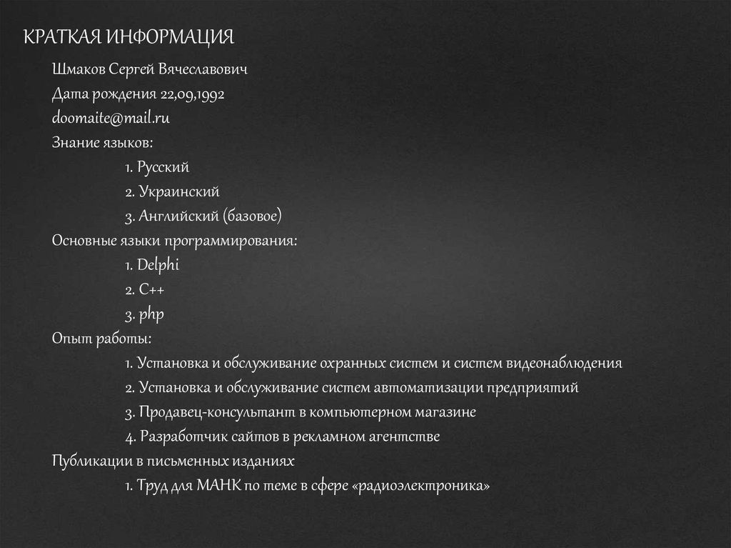 КРАТКАЯ ИНФОРМАЦИЯШмаков Сергей Вячеславович