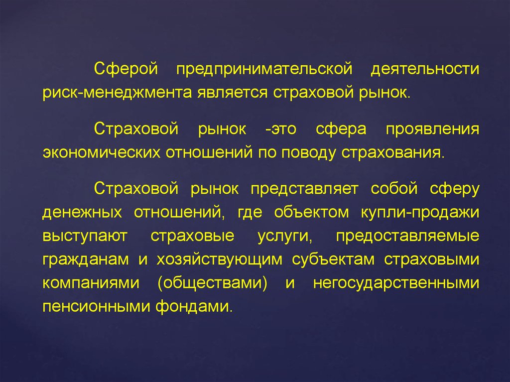 Сферой предпринимательской деятельностириск-менеджмента является страховой рынок.