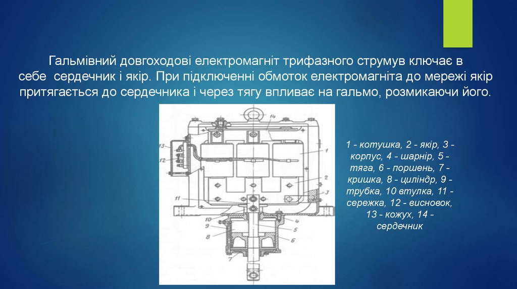 Гальмівний довгоходові електромагніт трифазного струмув ключає всебе сердечник і якір. При підключенні обмоток електромагніта до мережі якір