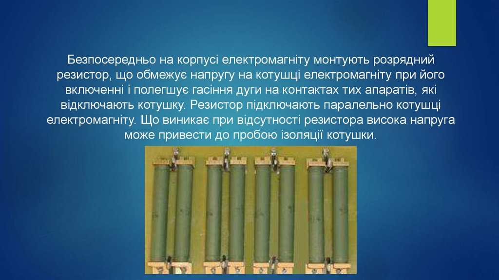 Безпосередньо на корпусі електромагніту монтують розряднийрезистор, що обмежує напругу на котушці електромагніту при його