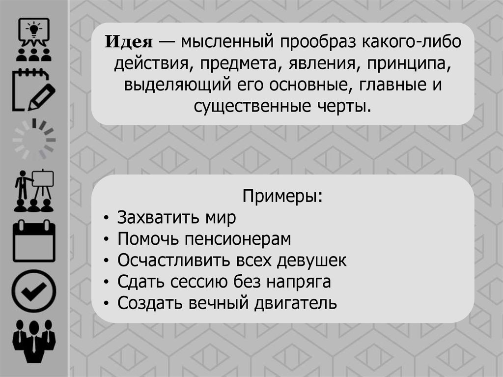 Идея — мысленный прообраз какого-либодействия, предмета, явления, принципа,