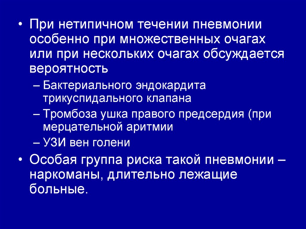 • При нетипичном течении пневмонииособенно при множественных очагах