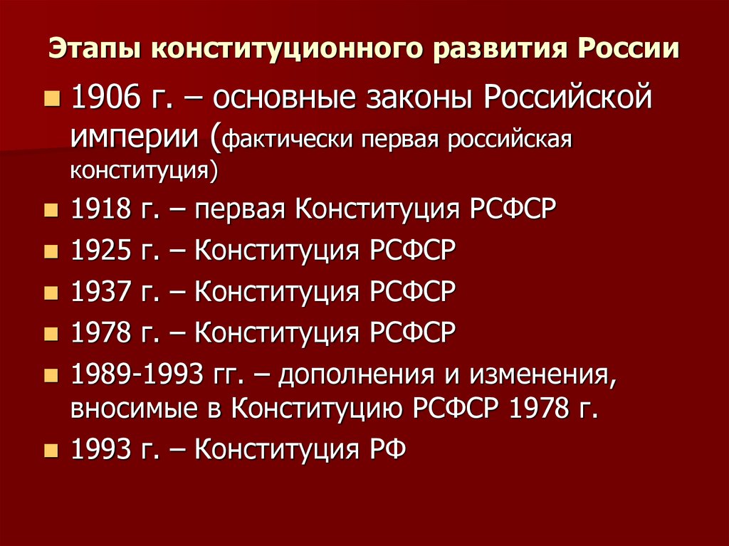 Этапы конституционного развития России1906 г. – основные законы Российской