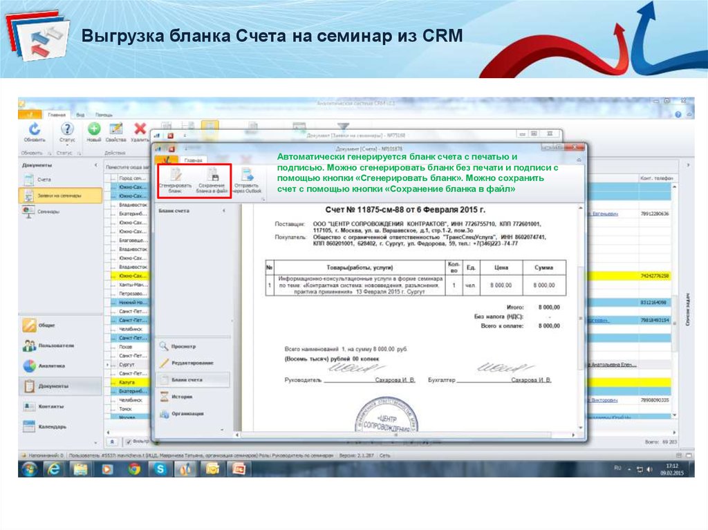 Выгрузка бланка Счета на семинар из CRMАвтоматически генерируется бланк счета с печатью и