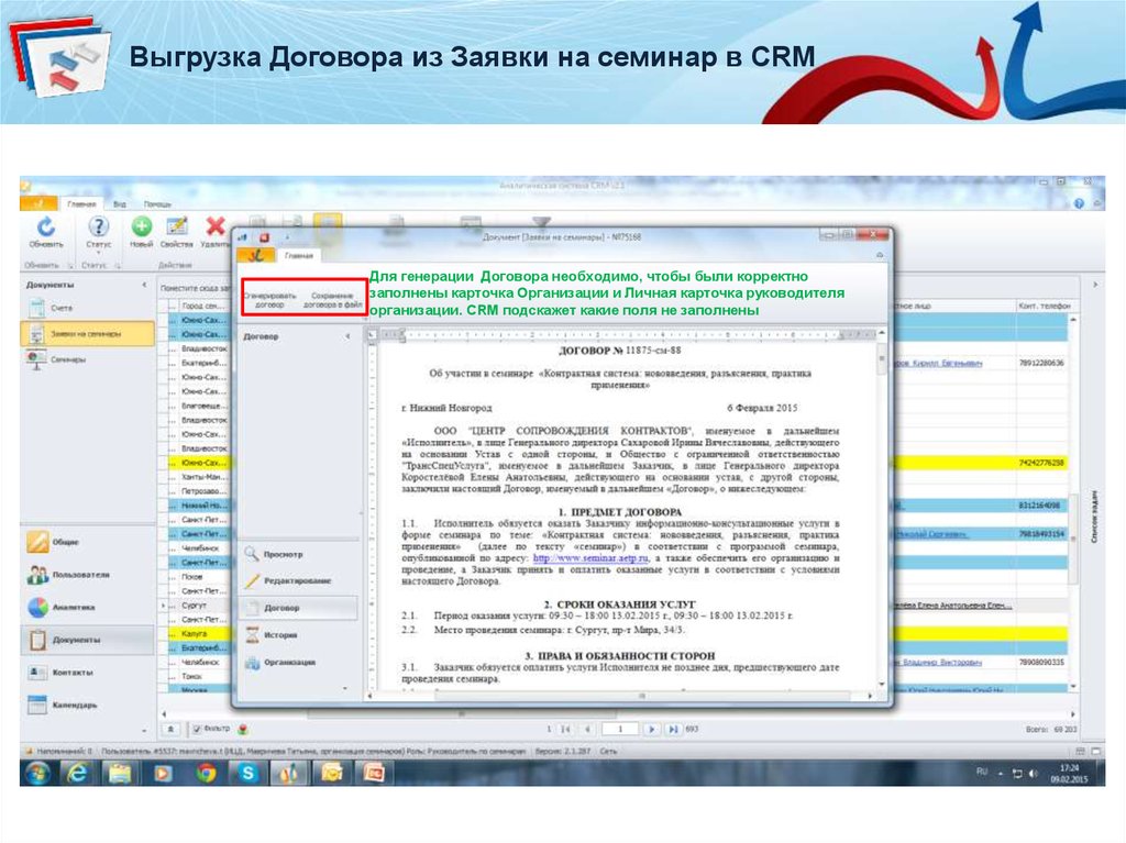 Выгрузка Договора из Заявки на семинар в CRMДля генерации Договора необходимо, чтобы были корректно