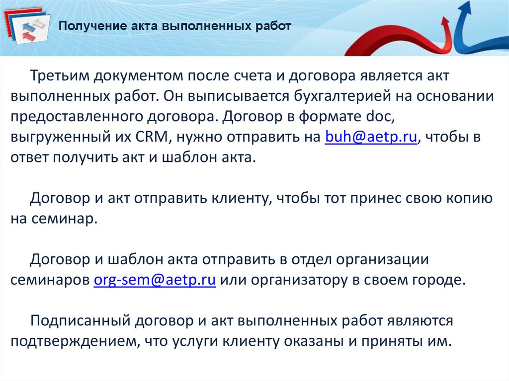 Получение акта выполненных работТретьим документом после счета и договора является акт