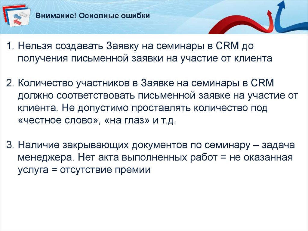 Внимание! Основные ошибки1. Нельзя создавать Заявку на семинары в CRM до