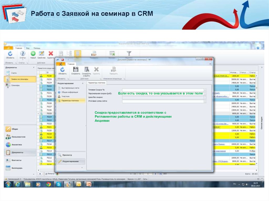 Работа с Заявкой на семинар в CRMЕсли есть скидка, то она указывается в этом поле