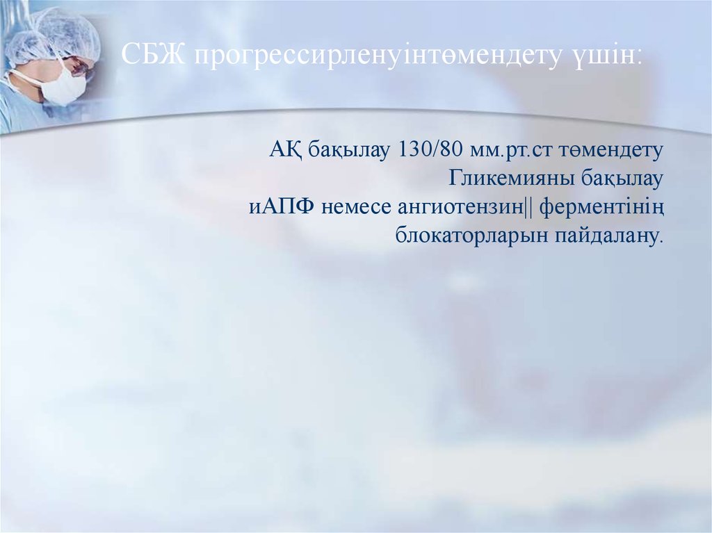 СБЖ прогрессирленуінтөмендету үшін:АҚ бақылау 130/80 мм.рт.ст төмендету