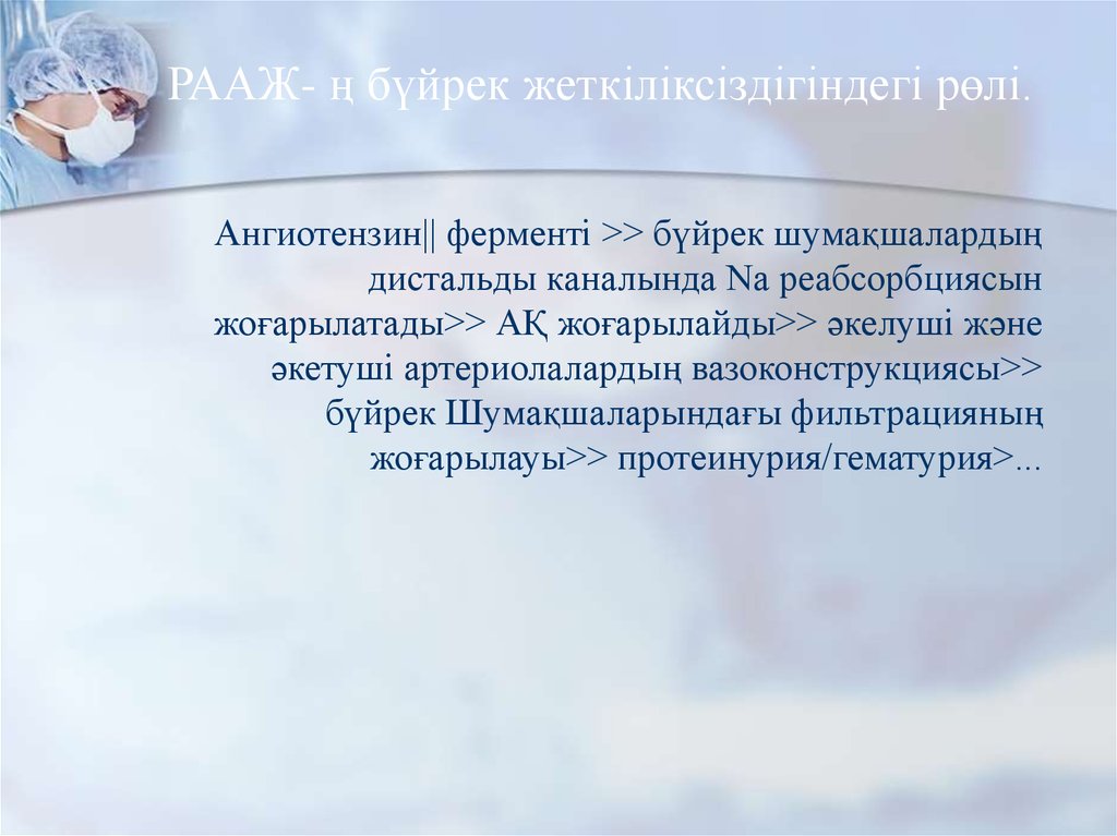 РААЖ- ң бүйрек жеткіліксіздігіндегі рөлі.Ангиотензин|| ферменті >> бүйрек шумақшалардың