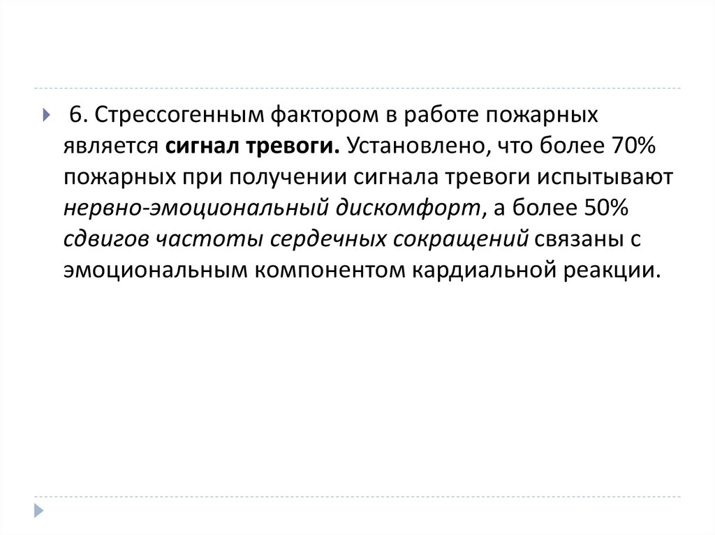 6. Стрессогенным фактором в работе пожарныхявляется сигнал тревоги. Установлено, что более 70%