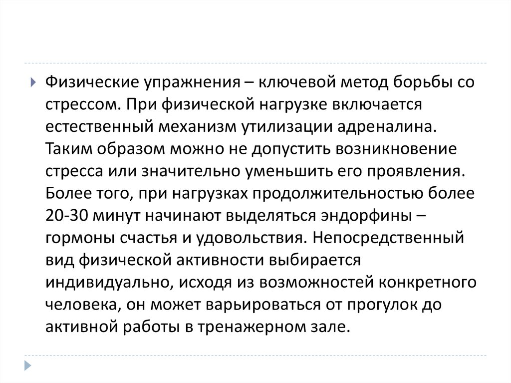 Физические упражнения – ключевой метод борьбы сострессом. При физической нагрузке включается