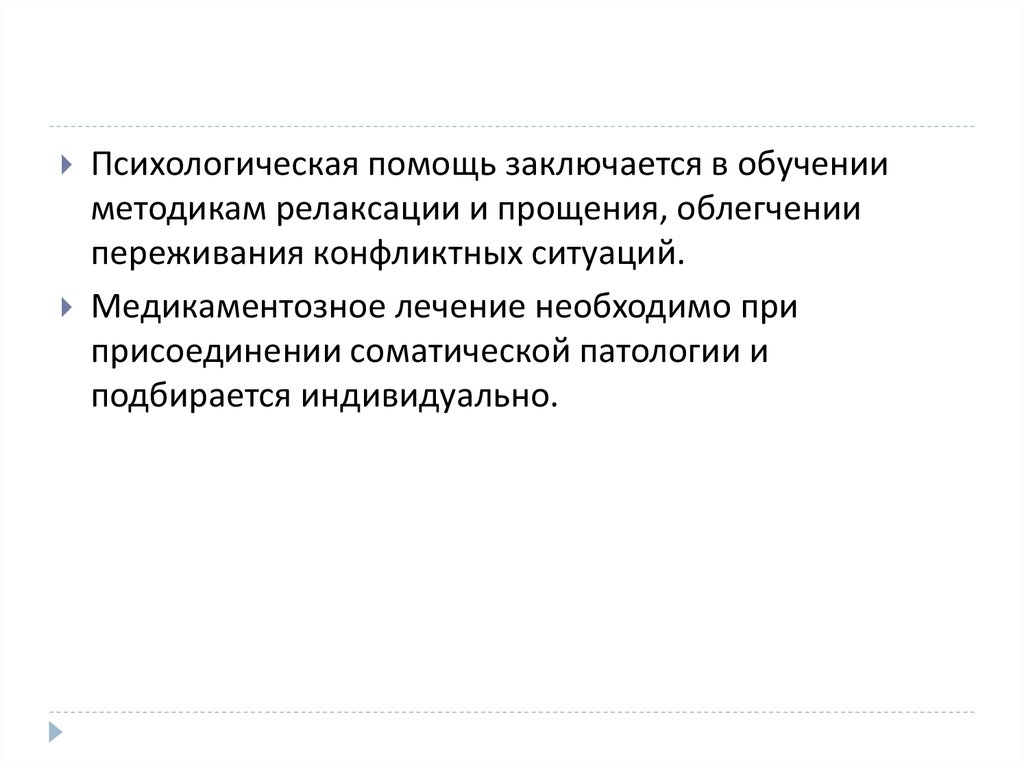 Психологическая помощь заключается в обученииметодикам релаксации и прощения, облегчении