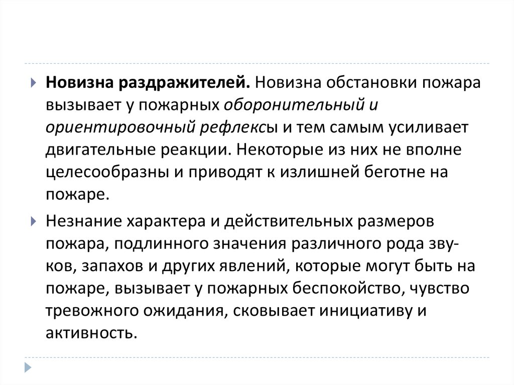 Новизна раздражителей. Новизна обстановки пожаравызывает у пожарных оборонительный и