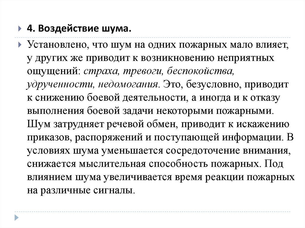 4. Воздействие шума.Установлено, что шум на одних пожарных мало влияет,