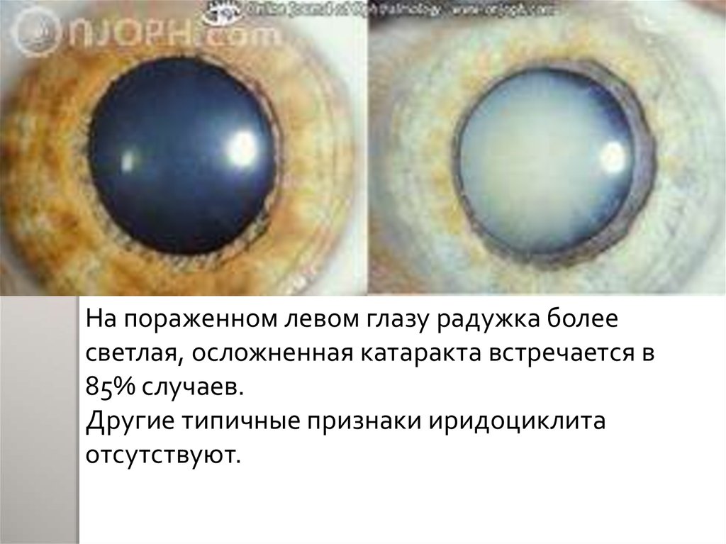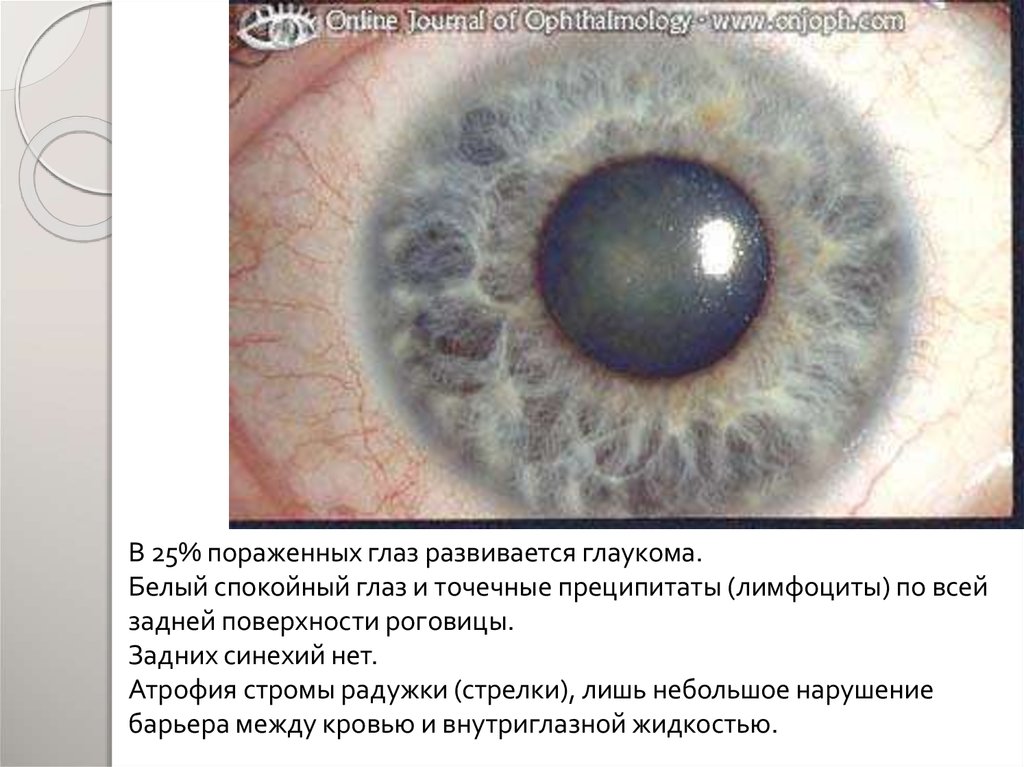 В 25% пораженных глаз развивается глаукома.Белый спокойный глаз и точечные преципитаты (лимфоциты) по всей