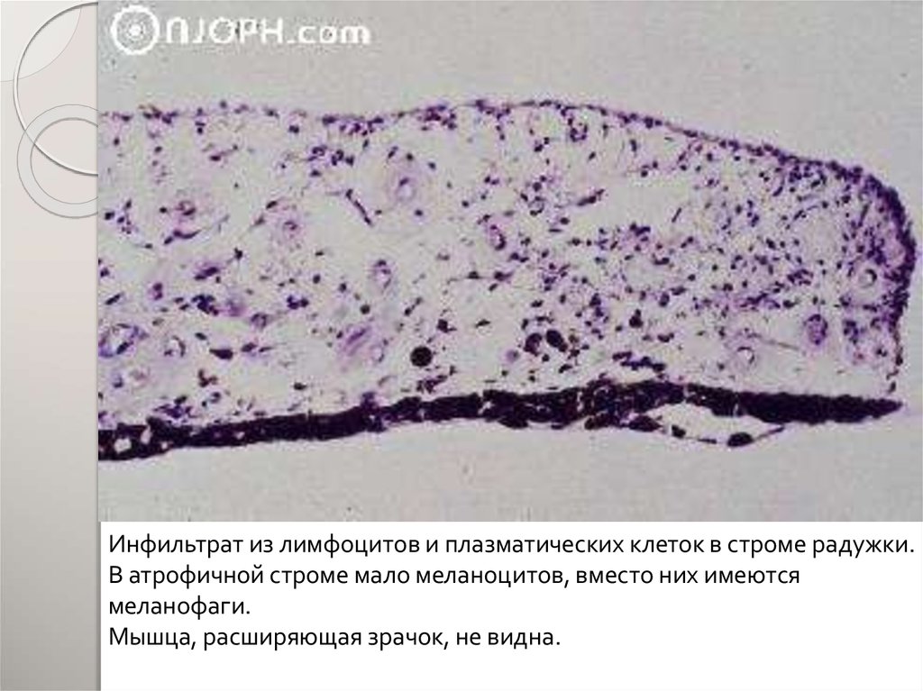 Инфильтрат из лимфоцитов и плазматических клеток в строме радужки.В атрофичной строме мало меланоцитов, вместо них имеются
