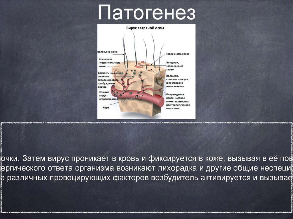 Патогенезлочки. Затем вирус проникает в кровь и фиксируется в коже, вызывая в её пове