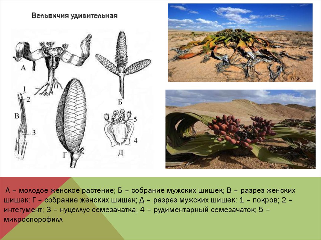 Вельвичия удивительнаяА – молодое женское растение; Б – собрание мужских шишек; В – разрез женских