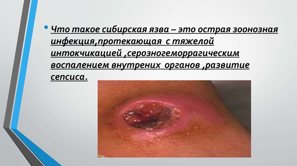 • Что такое сибирская язва – это острая зоонознаяинфекция,протекающая с тяжелой