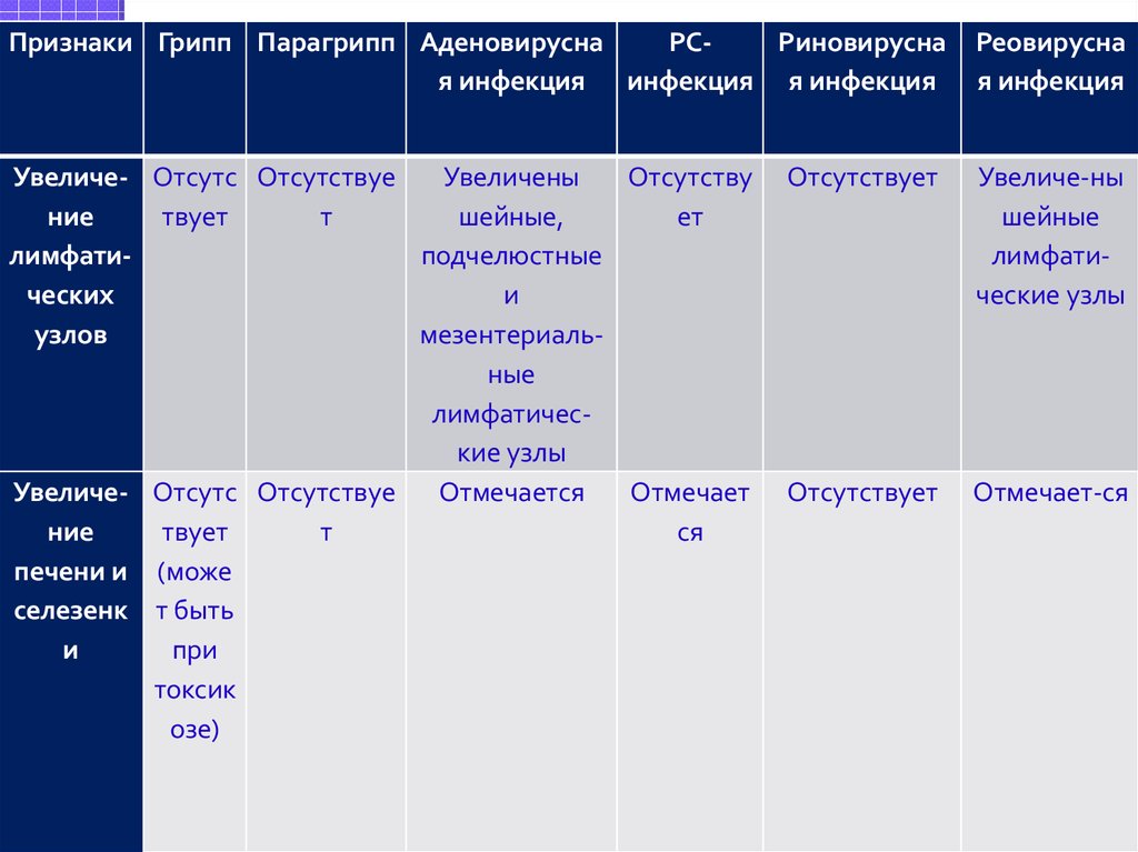 Признаки Грипп Парагрипп АденовируснаРСРиновирусна