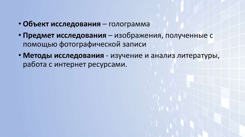 .• Объект исследования – голограмма