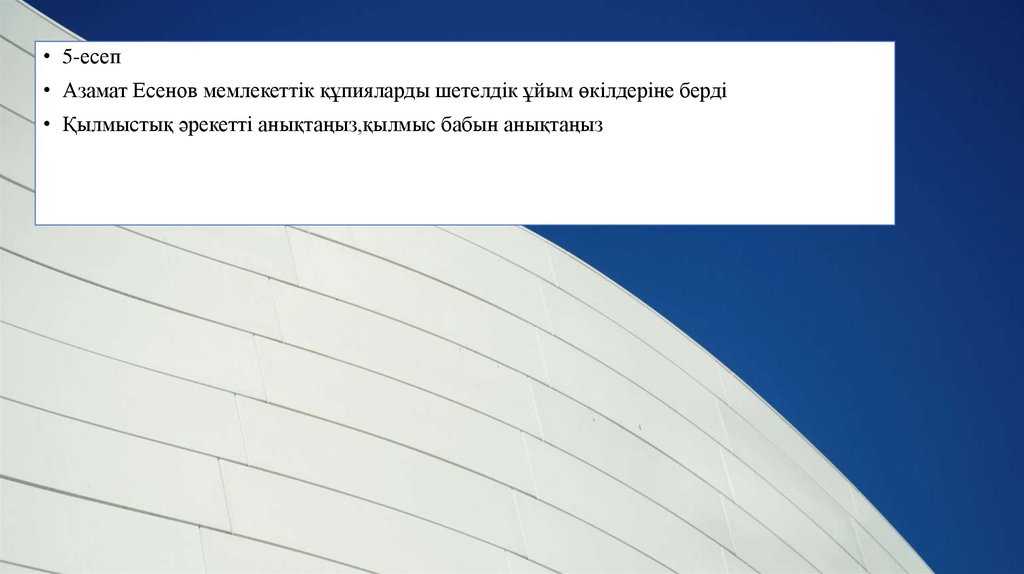 • 9-есеп• Астана қаласы әкімі болған азамат З ЖШС құрылтайшысы азамат М кездесті. Ол