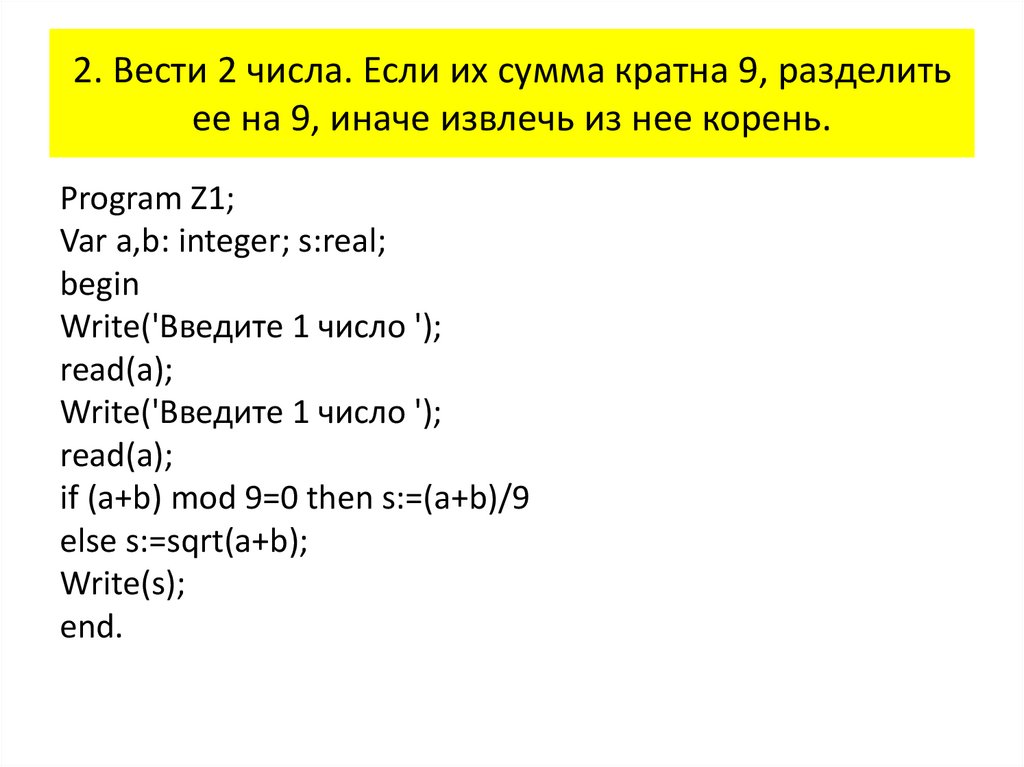 2. Вести 2 числа. Если их сумма кратна 9, разделитьее на 9, иначе извлечь из нее корень.