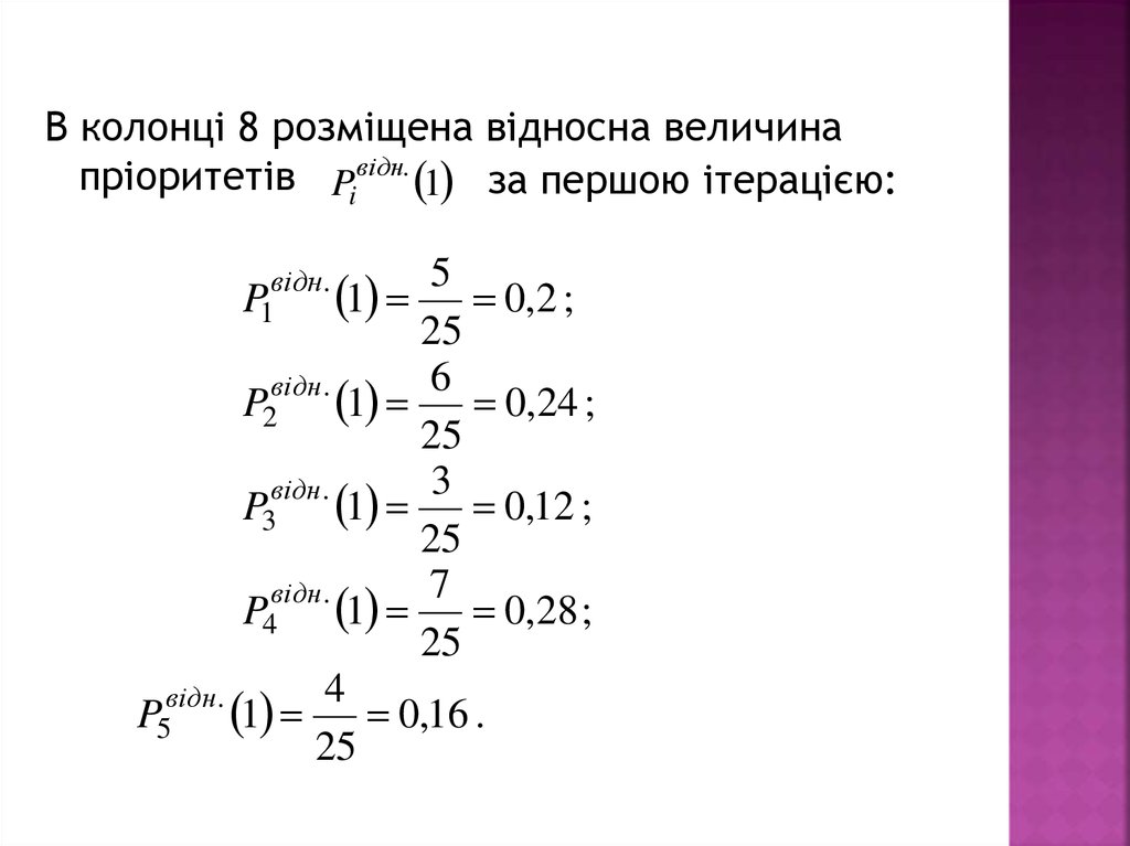 В колонці 8 розміщена відносна величинапріоритетів Piвідн. 1 за першою ітерацією: