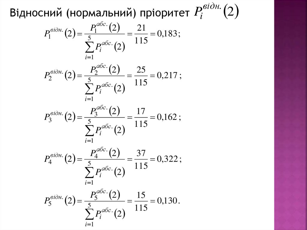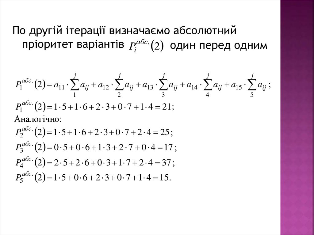 По другій ітерації визначаємо абсолютнийпріоритет варіантів Piабс. 2 один перед одним