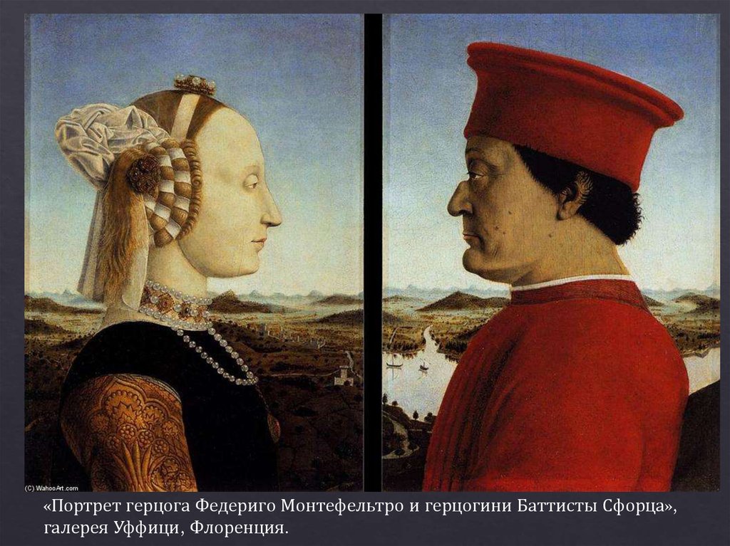 «Портрет герцога Федериго Монтефельтро и герцогини Баттисты Сфорца»,галерея Уффици, Флоренция.
