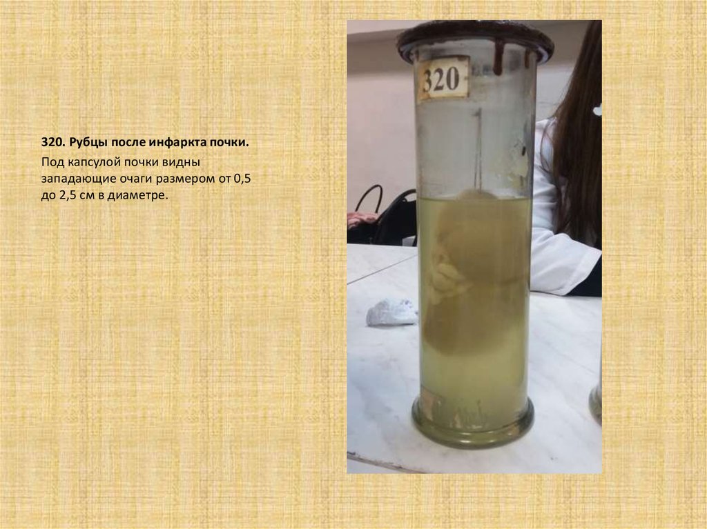 320. Рубцы после инфаркта почки.Под капсулой почки видны