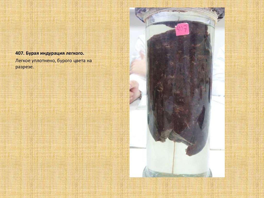 407. Бурая индурация легкого.Легкое уплотнено, бурого цвета на